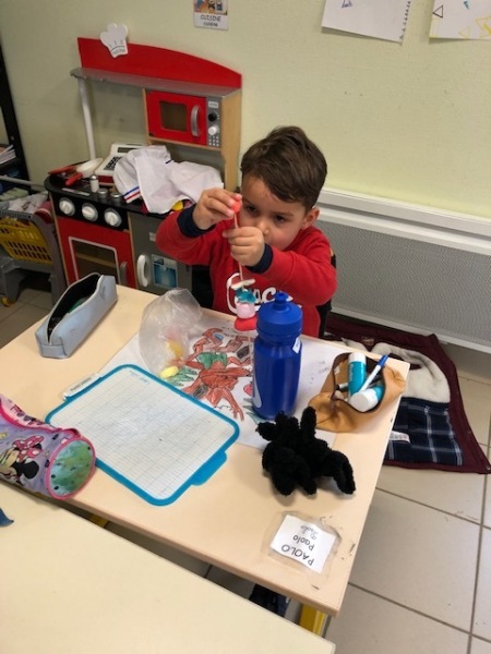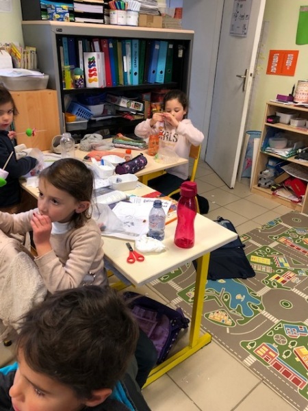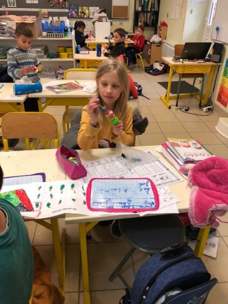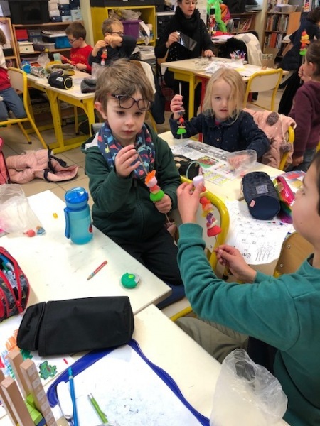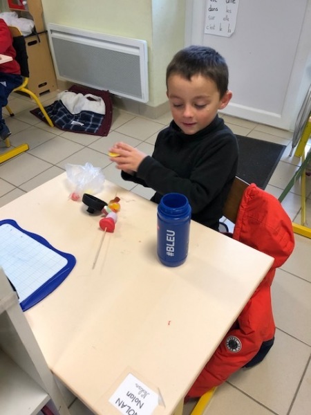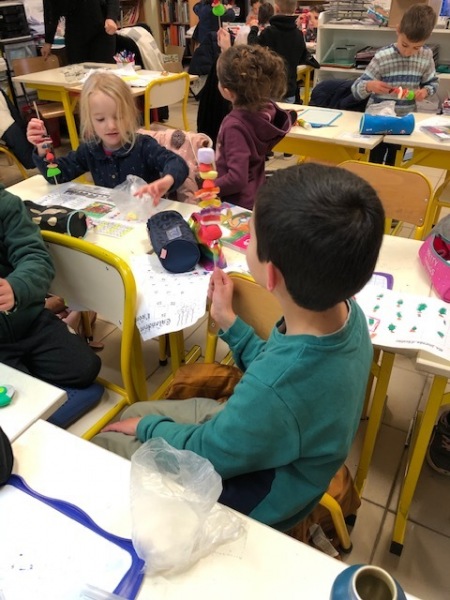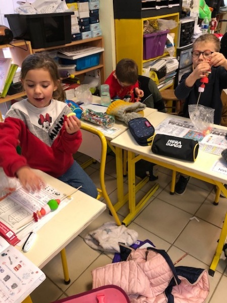 Mardi 6 décembre, la maman de Loucas est venue nous aider à fabriquer des brochettes de bonbons pour la soirée de Noël. Nous avons enfilé plusieurs bonbons sur un pic. Ça nous collait les doigts !
