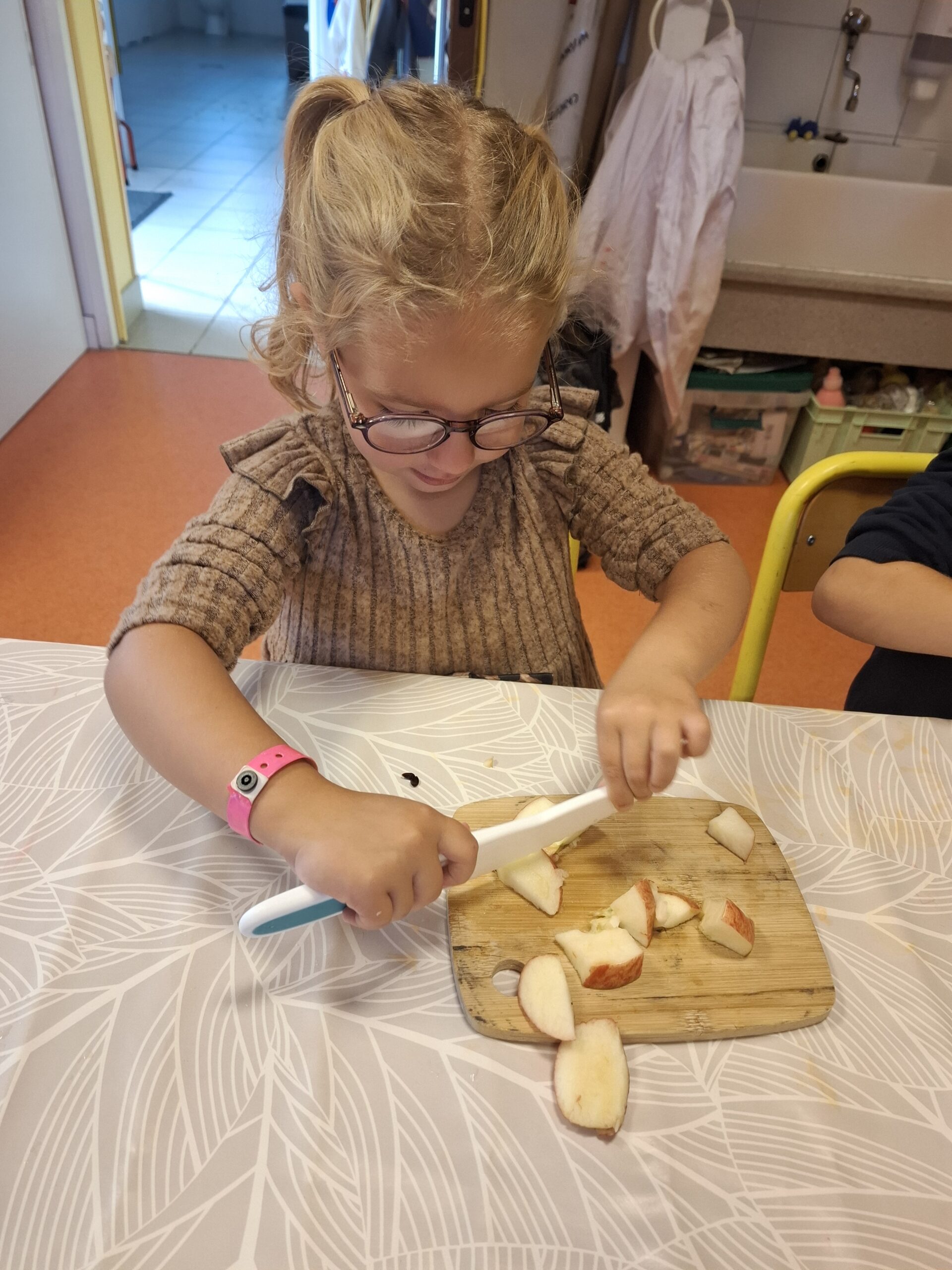 Nous avons d’abord appris à couper des pommes, ainsi que tout le vocabulaire lié : éplucher, couper, trognon, pépin, peau, épluchures, économe, chair, pédoncule, pommier…