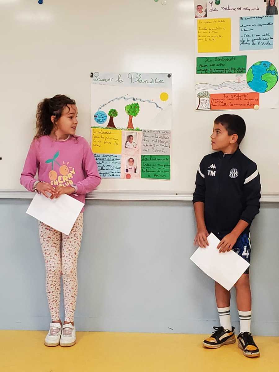 Le lundi, des binômes paritaires d’élèves de CE1 CE2 et de CM1 CM2 nous ont présentés leur programme pour améliorer l’école. Ces propositions s’appuyaient sur 3 thèmes : la solidarité, la biodiversité, la gestion des ressources et déchets.