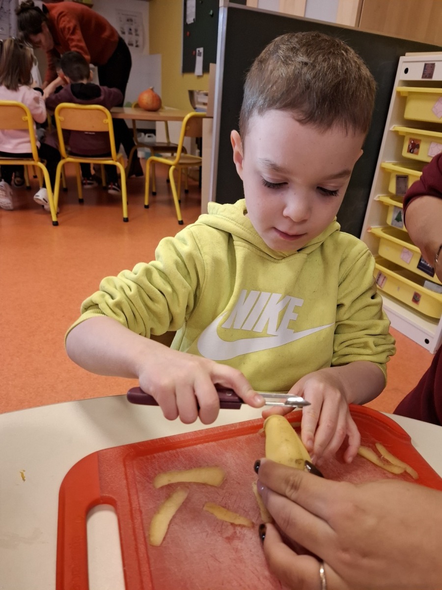 Nous avons travaillé sur la croissance d’un potiron, reconstitué le titre de l’album, travaillé sur l’ordre chronologique de la soupe. Nous avons aussi dessiné le potiron et nommé ce qui le compose : pédoncule, graines, filaments, peau et chair.