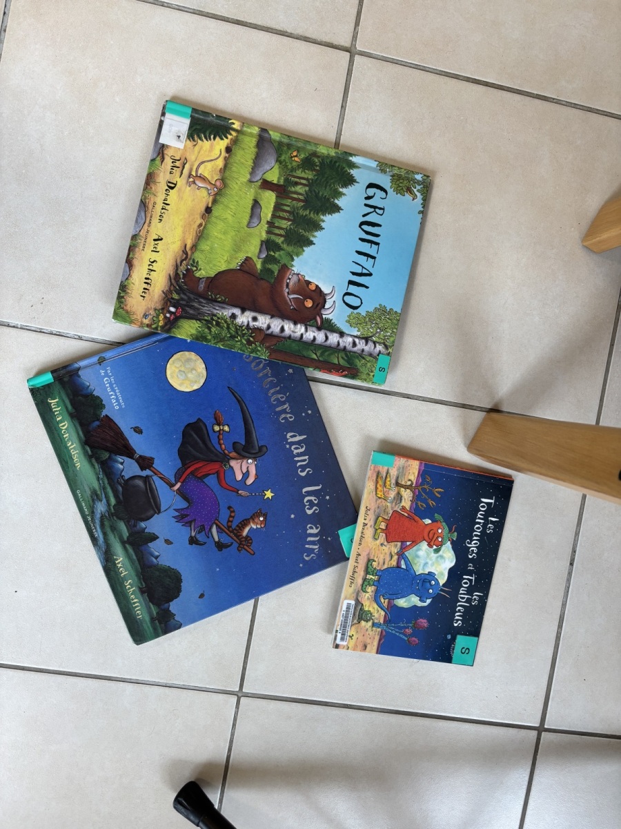 Lors de la première séance, nous avons découvert tous ces livres : Gruffalo, Les tourouges et les toubleus, la la sorcière dans les airs, Le petit Gruffalo.
