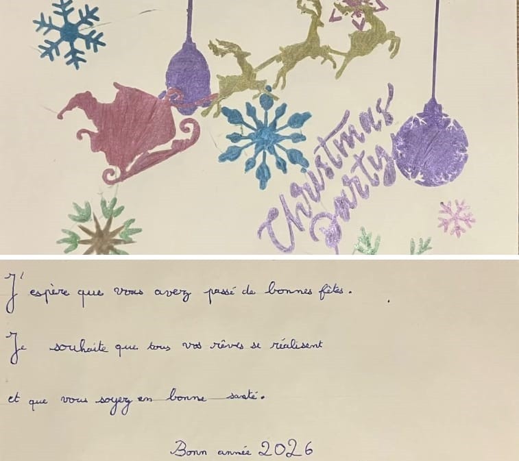 Dans le cadre de notre projet d’année autour du civisme, pour bien vivre ensemble, nous avons proposé aux élèves, de la petite section jusqu’au CM2, d’écrire puis d’illustrer leur carte de vœux 2026. Pour les plus grands, ce fut l’occasion de travailler la correspondance et la structure d’une carte de vœux.